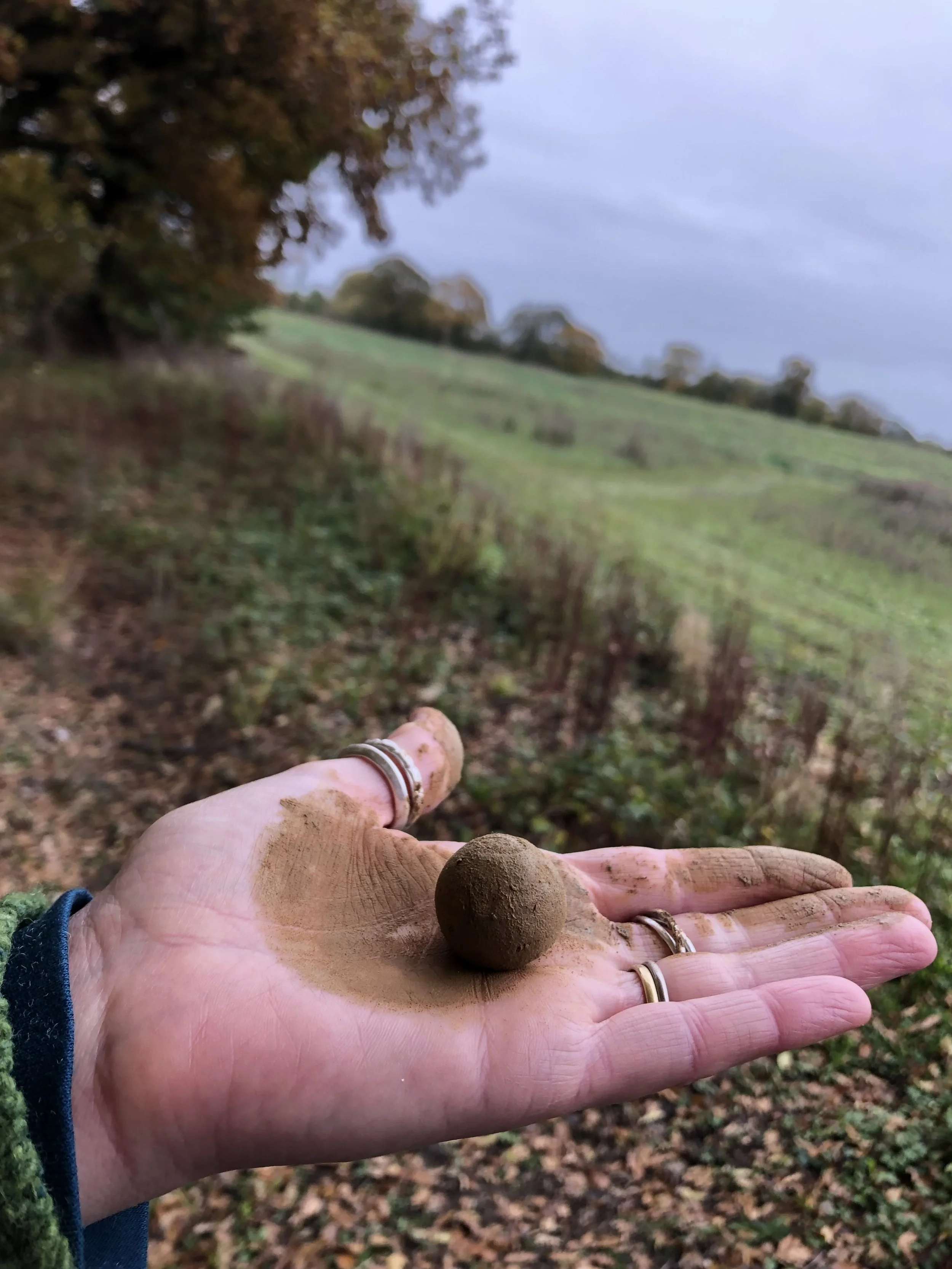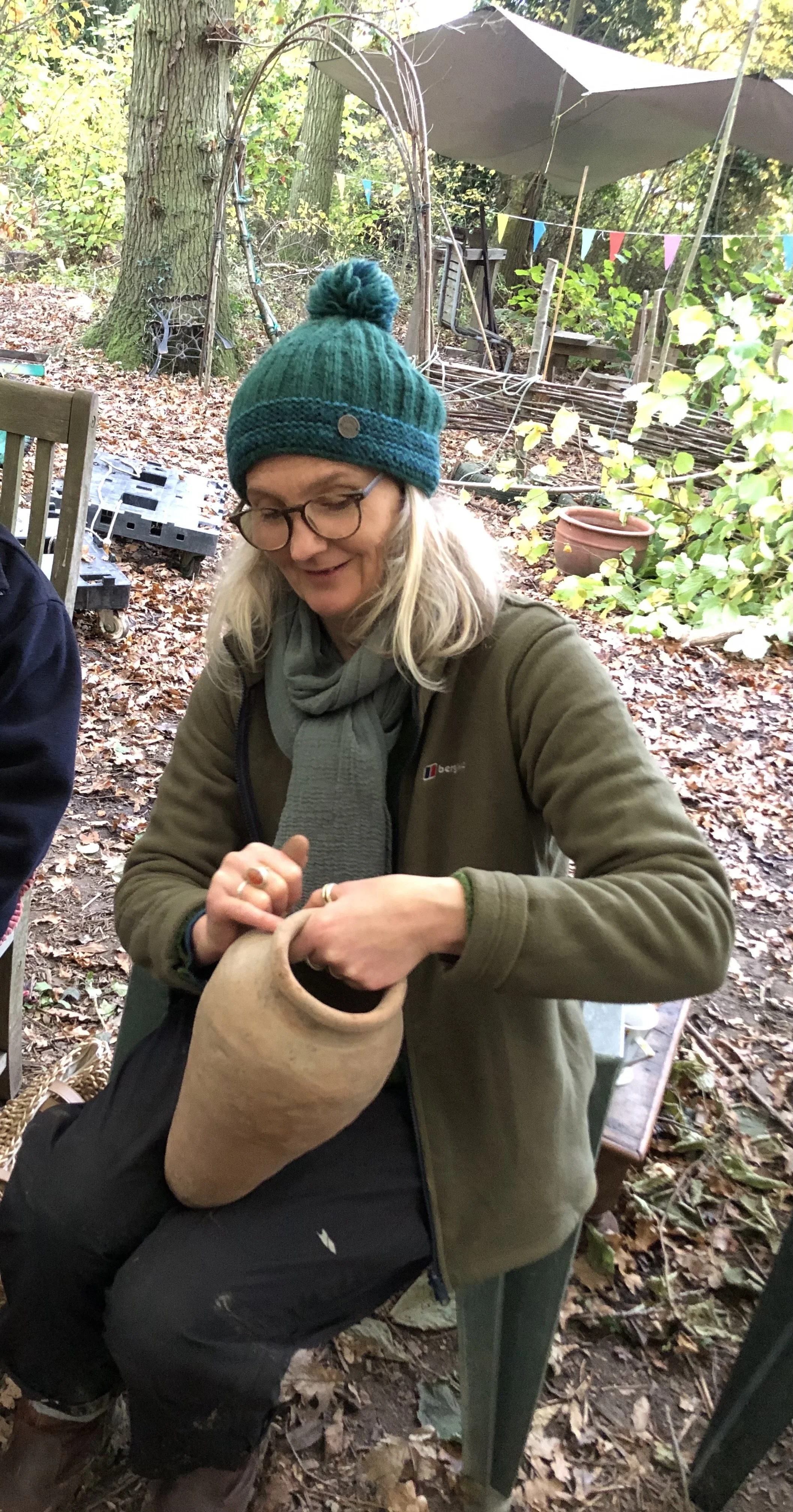 Teaching Forest School and clay work in the community and schools for many years has nurtured and nourished relationships and connections between the land and each other. Through outdoor creative play, curiosity and process led making, using wild clays and fibres, natural materials and basic tools, we can deepen our understanding of local landscapes, ecologies and the seasons. This in turn enhances a sense of wellbeing and belonging, building and strengthening social and emotional bonds alongside increasing a sense of responsibility and stewardship for Earth’s finite resources. Often focused around small fires, groups are encouraged towards gentle conversation, to collectively enjoy, sitting, creating and being outdoors, to share tea and time together. The ethos that drives this work is circularity and reciprocity with land, seasons and community. This was at the heart of a recent series of pit firing sessions with an Elders group at Kinda Forest School in Suffolk, that involved digging, processing and firing work made from the local clay at their woodland site. Recollecting and sharing memories, foraging, processing and creating together, invited fun, company and friendship.